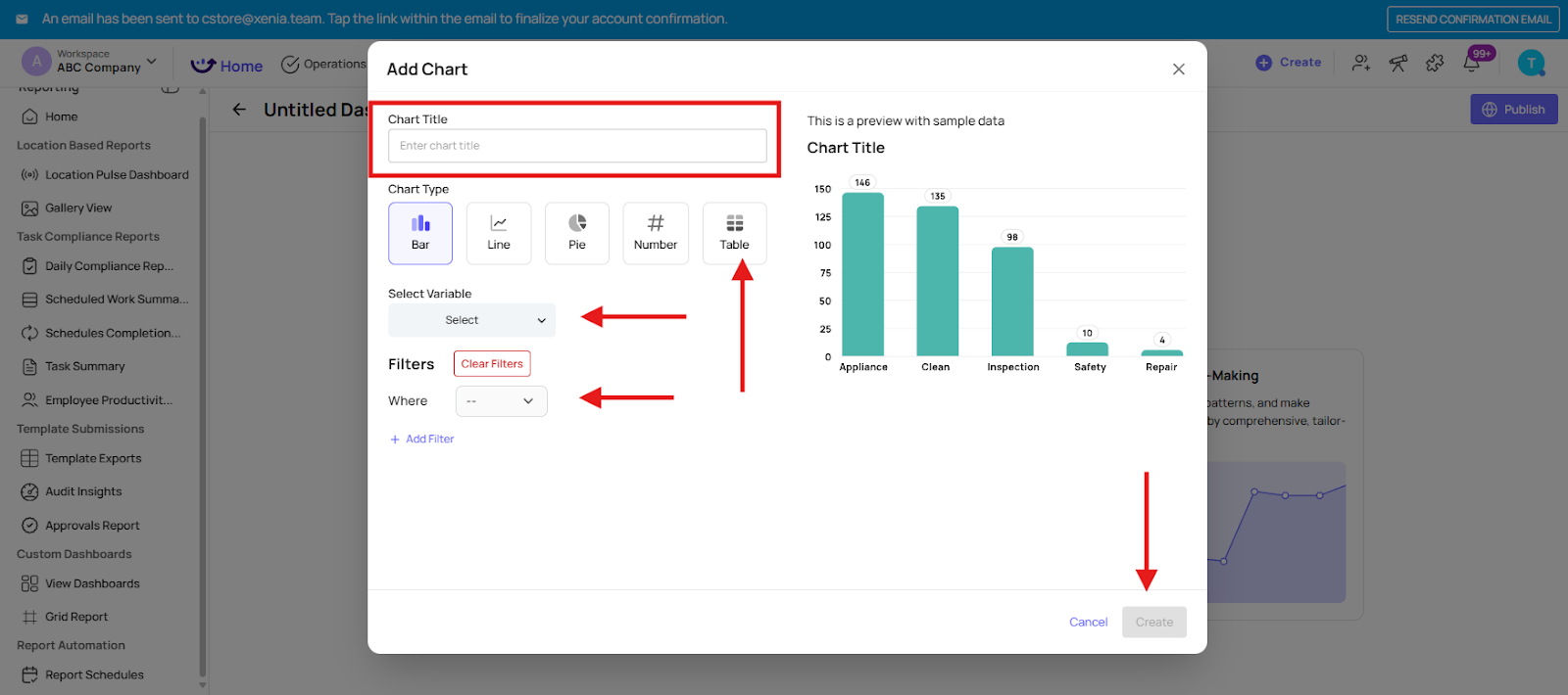 - Select Chart Type (Bar, Line, Pie, Number, Table)