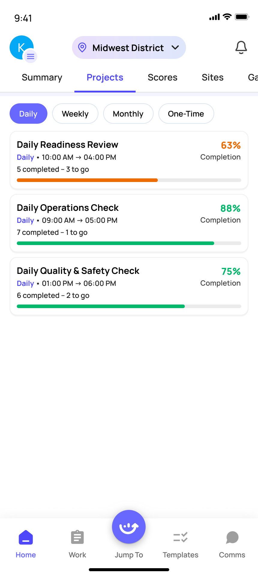 ■ End of Day • Review Projects tab to confirm all daily projects show completed across stores • Check for any open Corrective Actions that are still unresolved • Message any store managers with outstanding tasks via Chat |