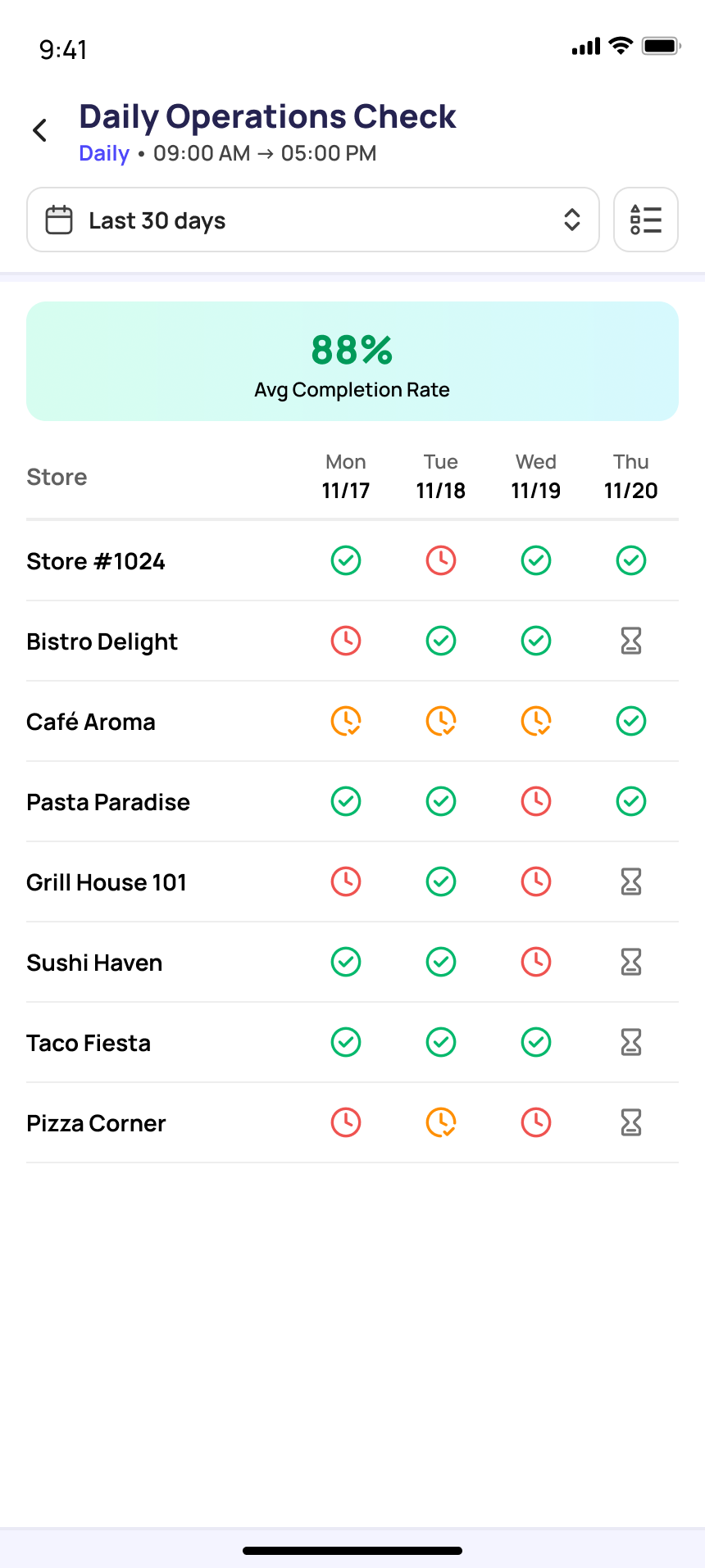 ■ Pro Tip Check the Summary tab every morning before 10 AM to confirm all stores have started their daily opening checklists. Any store showing 0% completion by mid-morning should be followed up with immediately. |