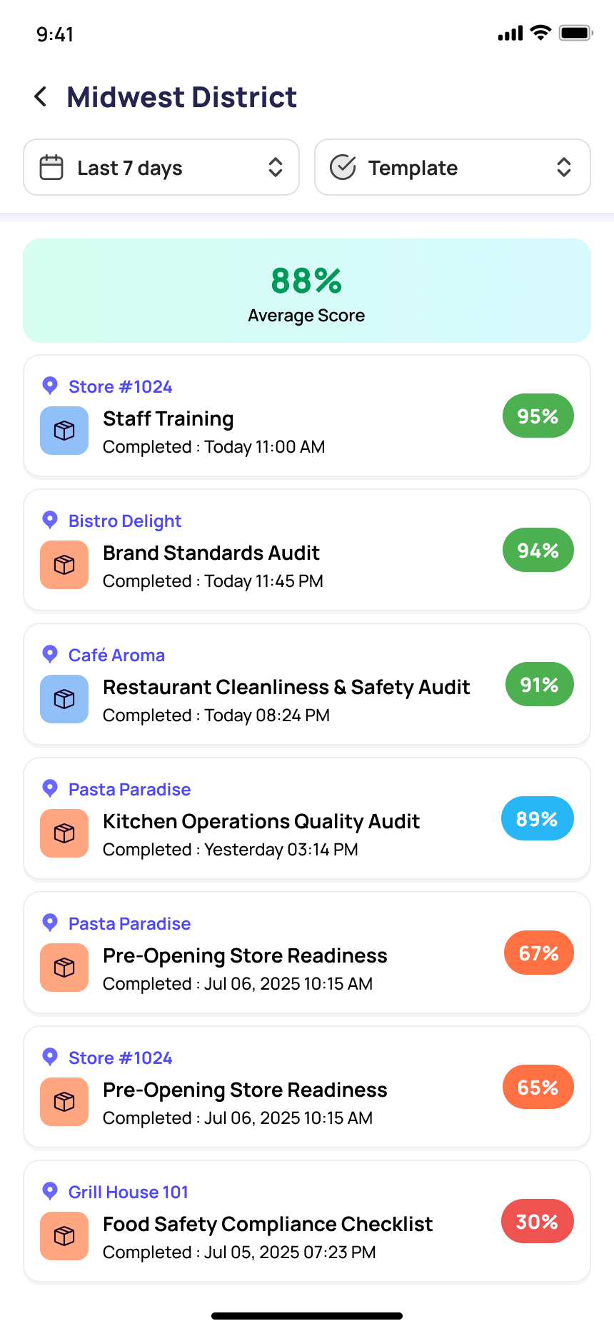 Review Location Scores Scores are calculated based on checklist completion and response quality across your stores. • Higher scores indicate consistent, on-time task completion • Lower scores flag stores that need attention or follow-up |
