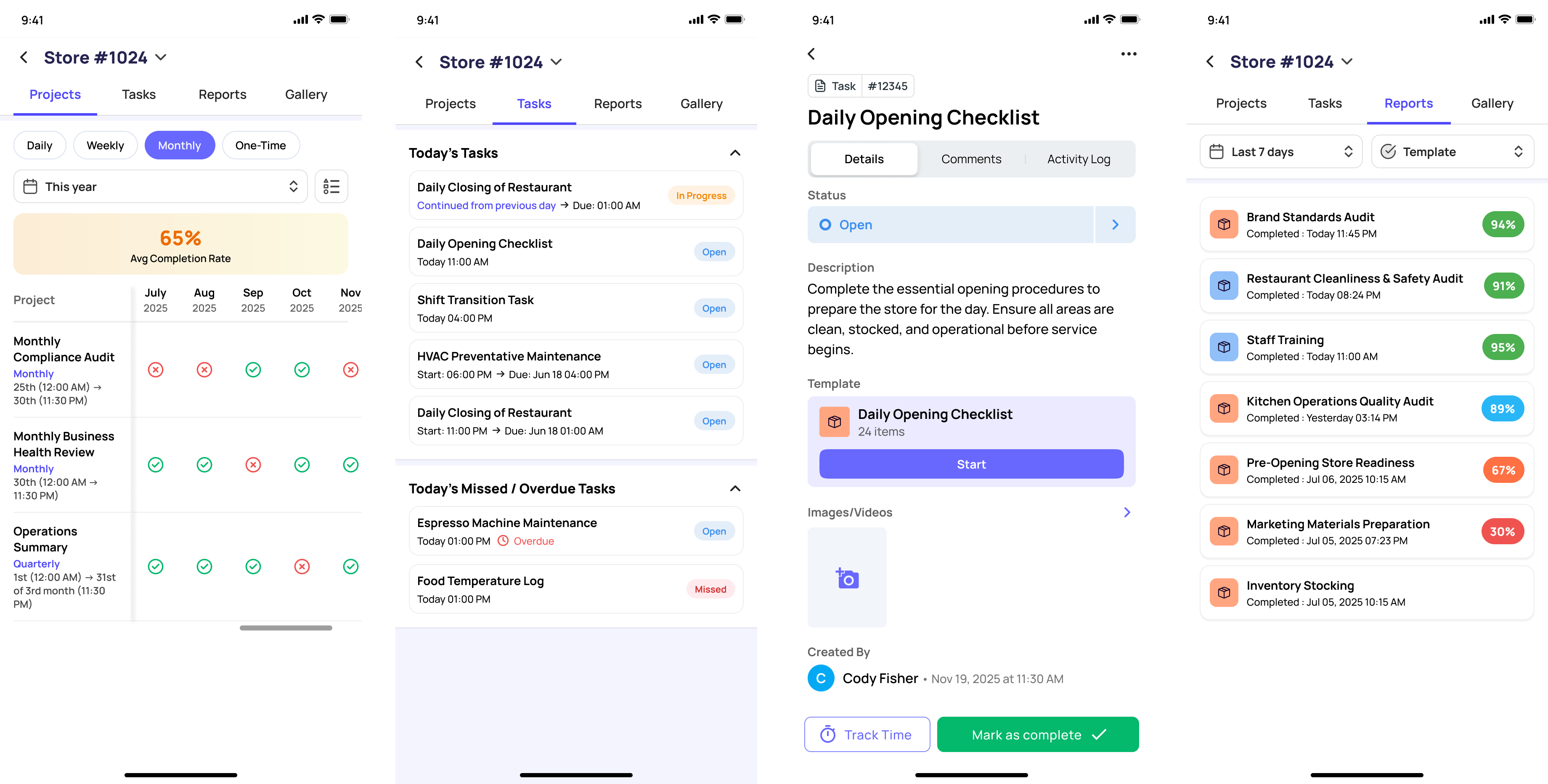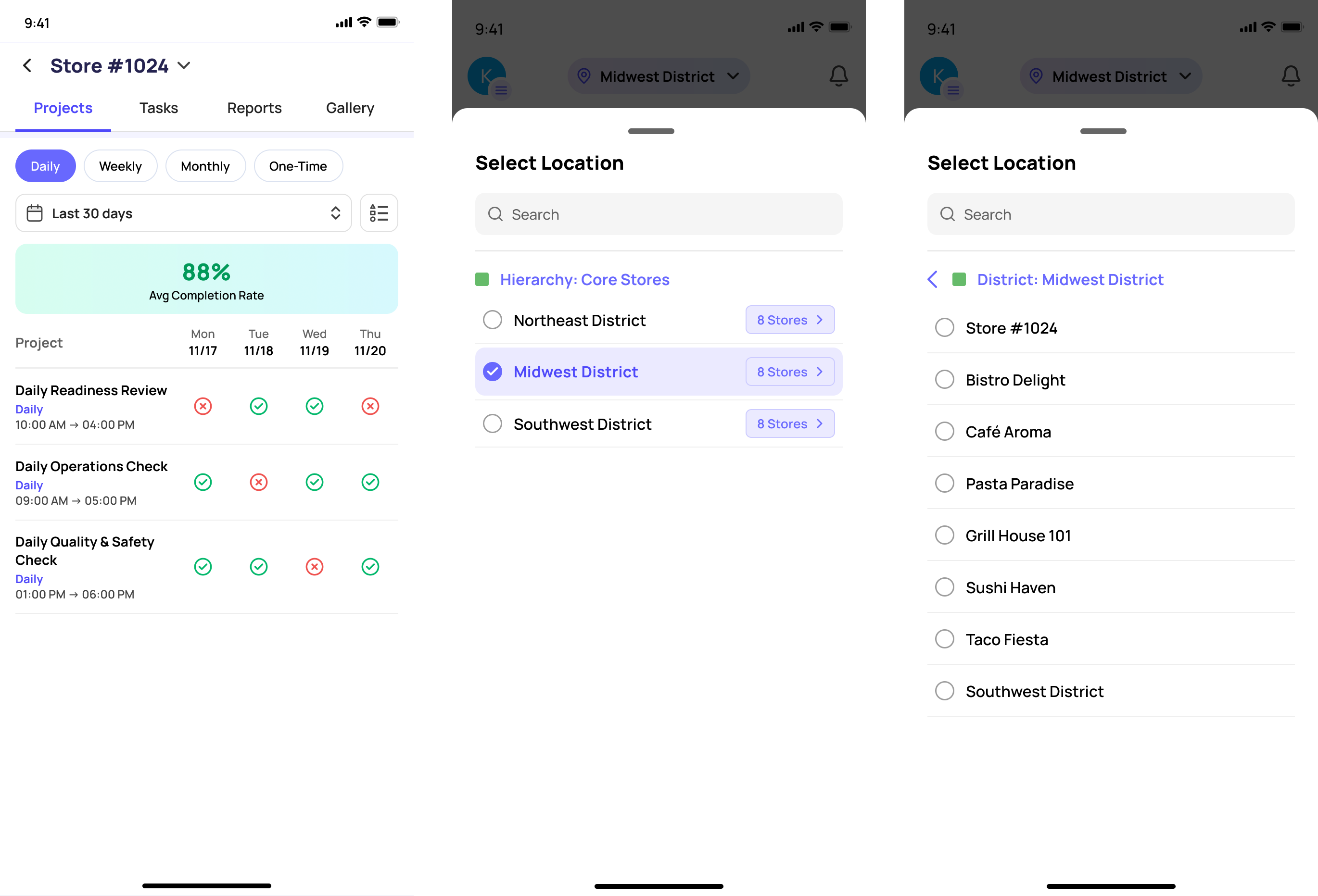 Tap Into a Store for Drill-Down Detail Tap any store name (e.g., Store #1024) to enter that store's individual view. Inside you will find four sub-tabs: Projects, Tasks, Reports, and Gallery. |