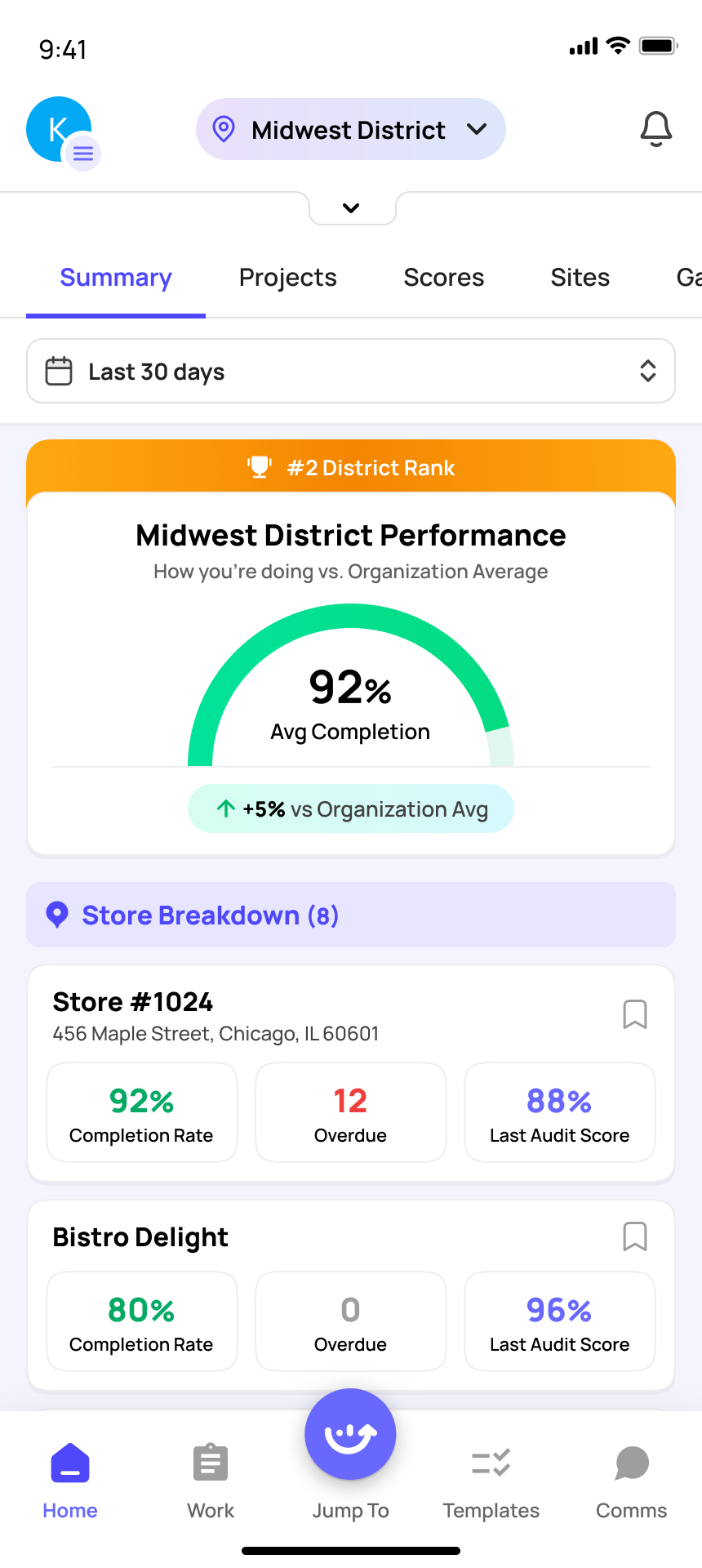 View Your Region/District Summary On the Summary tab you will see overall completion rates, overdue task counts, and a store-by-store breakdown so you can instantly spot which location needs attention. |