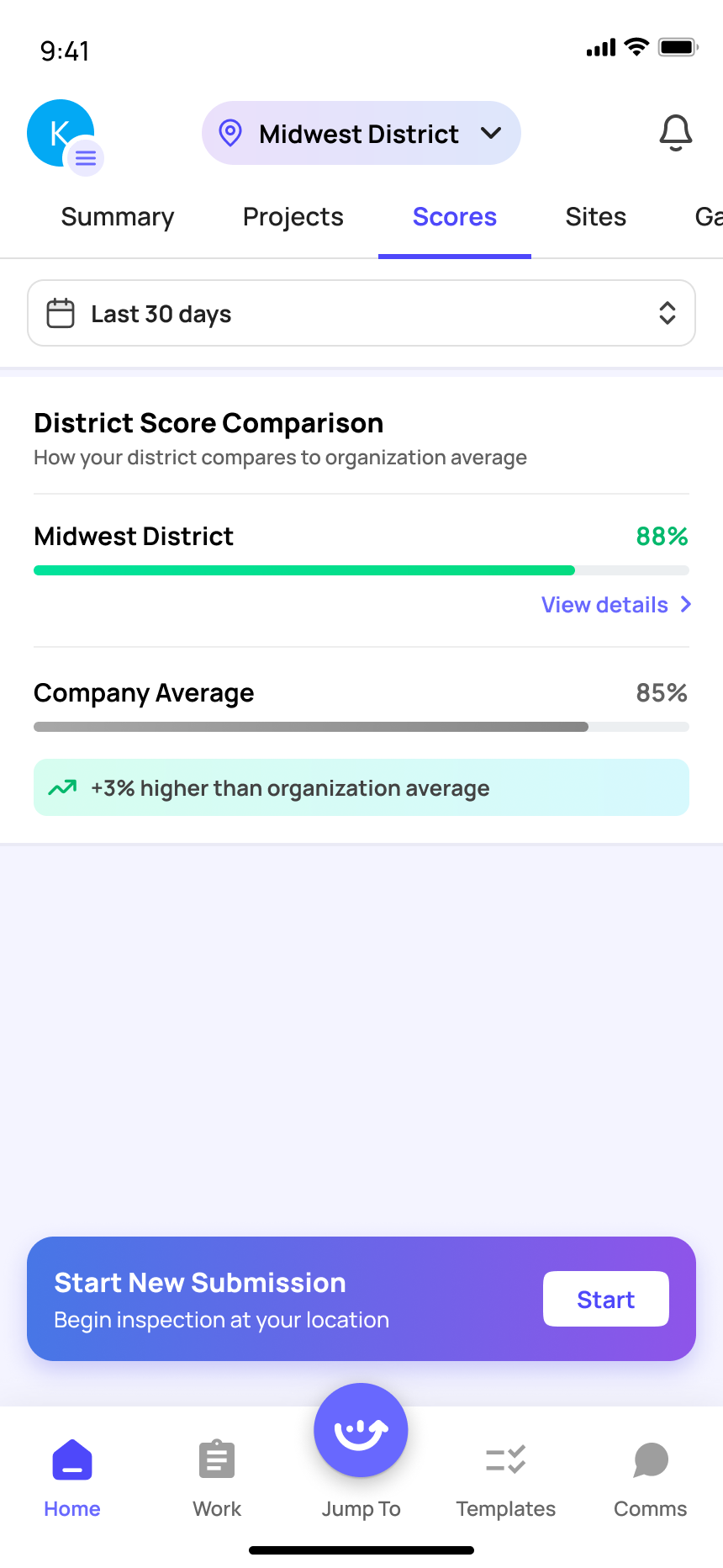 The Score tab displays performance and compliance scores across your district. Use it to benchmark stores against each other and identify locations that need coaching.