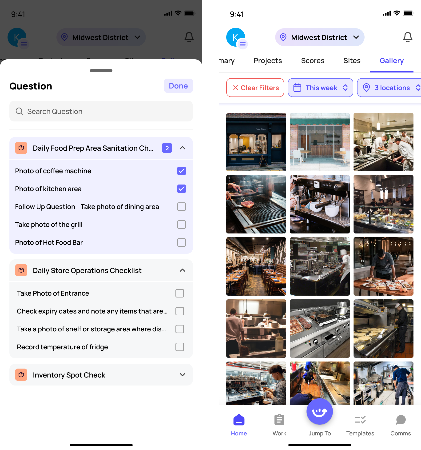 ■ Midday (Around 1 PM) • Go to Sites tab → tap any store showing incomplete tasks • Use the Due Date filter set to 'Today' to see morning checklist status • Check Gallery tab for any flagged equipment or cleanliness photos |