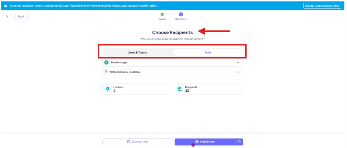 Next, you pick who will receive the announcement. You can target it very specifically by:Users, Teams, Locations and Roles. In your example, assigning it to the Store Manager role automatically pulls all users tied to that role across the selected locations. Here, you have 2 locations under that role, which brings up 33 users to receive the announcement. This ensures the right people see it without cluttering others’ dashboards.