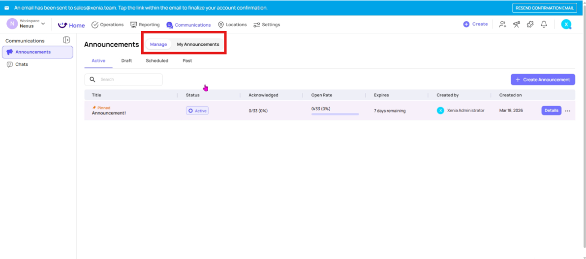 By clicking into the announcement, you can access the details and reporting: See who has acknowledged the announcement and who hasn’t. Check the open rate to understand engagement. Send reminders to users who haven’t acknowledged it yet. Export the data if you need a record or want to share it outside Xenia.