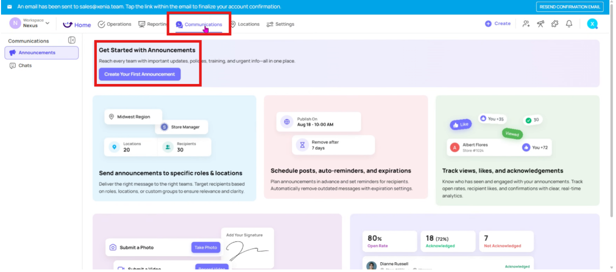 “In Xenia, first go to the Communications tab in your workspace. Now you’ll see it says ‘Get started with announcements. You can click ‘Create your first announcement’ from here.”