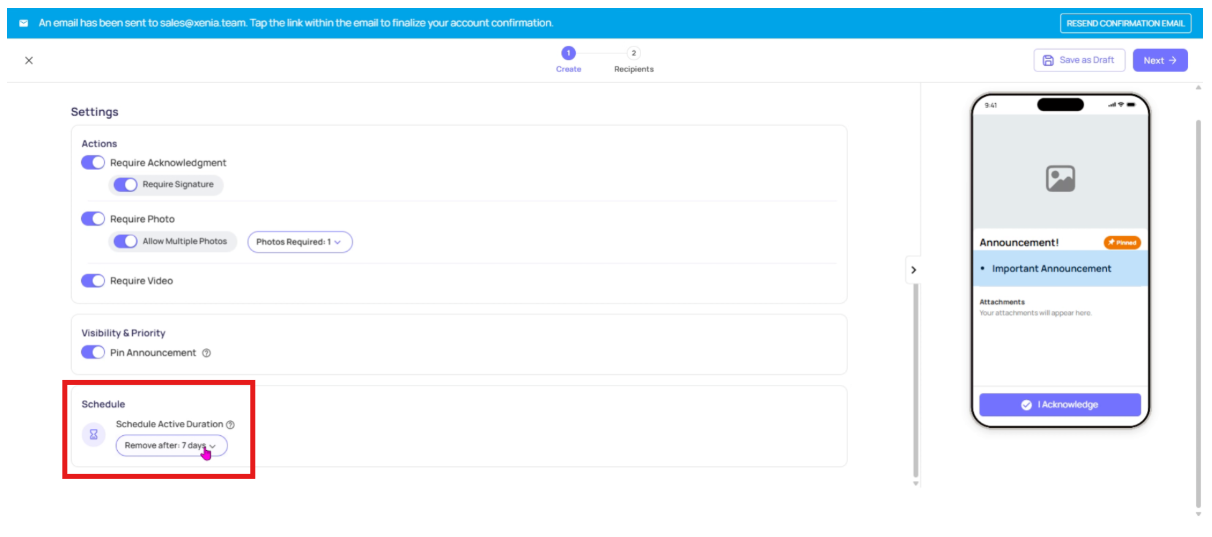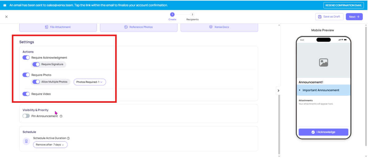 These settings let you make your announcement interactive and trackable. By requiring acknowledgement, signature, or media like photos or videos, you ensure that users not only see the announcement but actively confirm it. You can even control how many photos or videos they submit, giving you granular oversight on compliance or engagement.