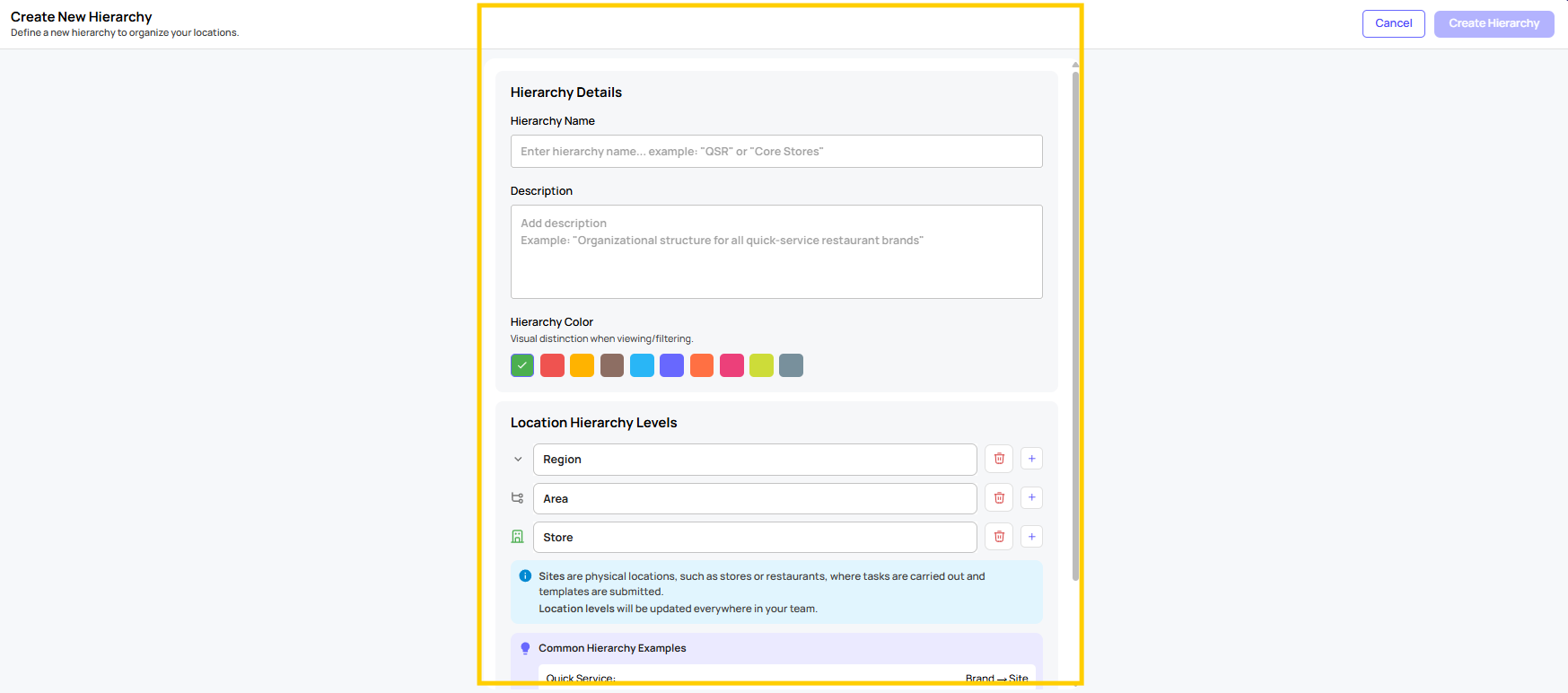 Hierarchy Details encompass the Hierarchy Name, Description, Hierarchy Color (for ease of visual distinction when viewing or filtering), and Location Hierarchy Levels. Sites represent the physical locations where tasks are executed, and templates are submitted.