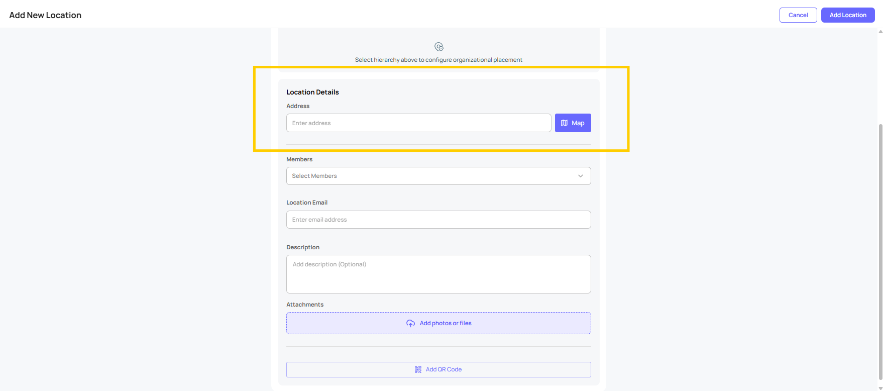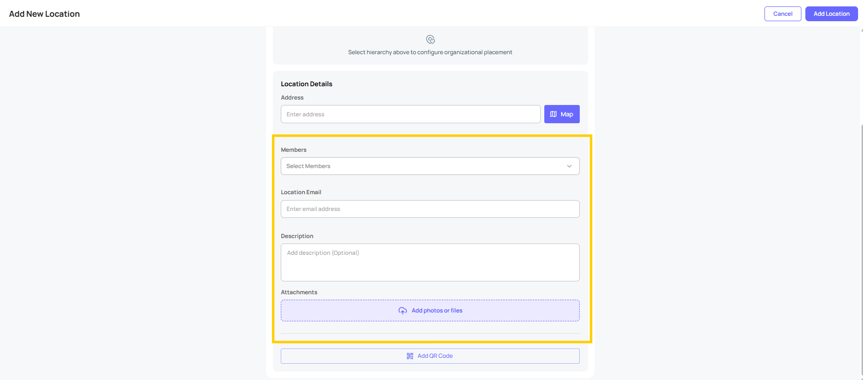 In addition to selecting members for a location, you can also input details such as the location name, email address, or a description, and then click the "Add Location" button.
