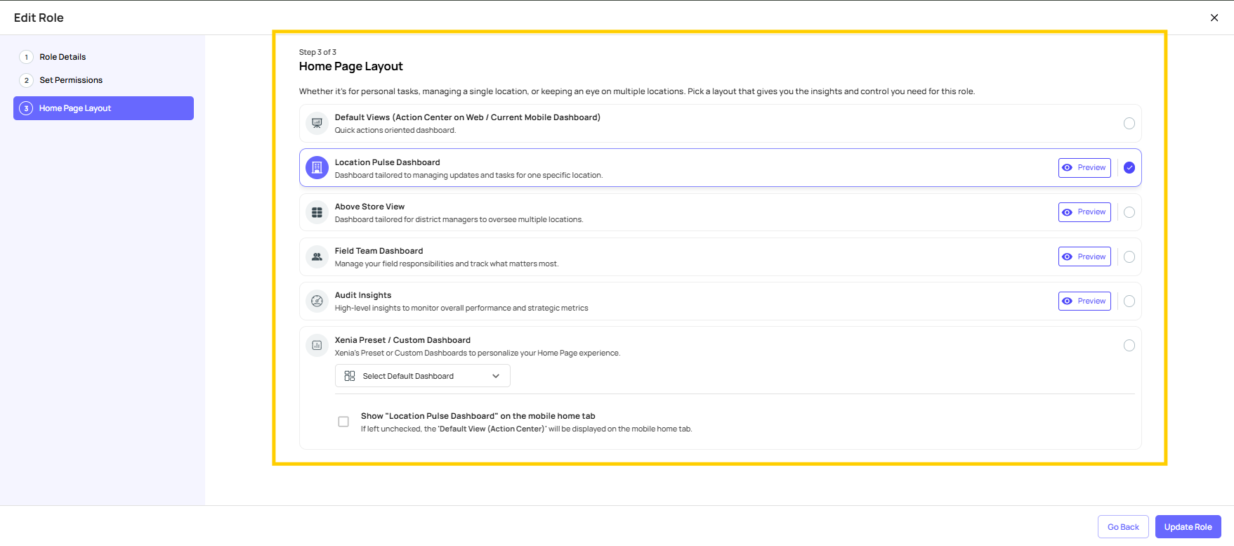 - Assignability in projects: When you build a project and assign it role-based, Xenia uses the role to determine who gets the task at each location. This is how you deploy "the daily opening checklist to every Store Manager across all 50 locations" with a single project creation. The role is the mechanism. If you named your role something generic like "Full User" instead of "Store Manager," your projects become harder to manage and read because you're assigning to "Full User" instead of a descriptive position name.