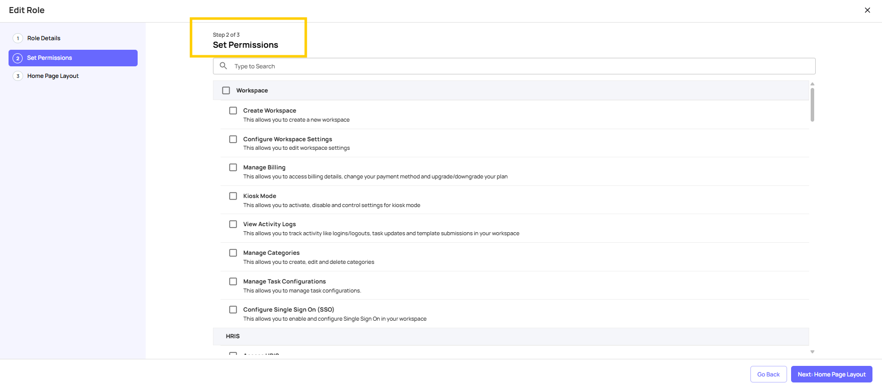 - Work through the same three steps: Details → Permissions → Homepage Layout