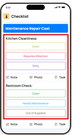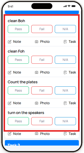 The Pass/Fail step allows users to indicate whether a condition meets standards. If a step is marked as Fail, users can be prompted to add notes, photos, or corrective actions.