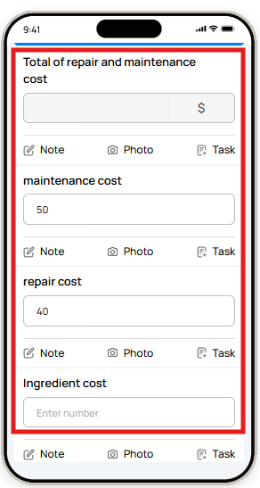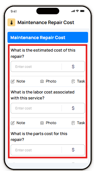 | Cost | Enters a dollar amount | Expense logging, maintenance costs |